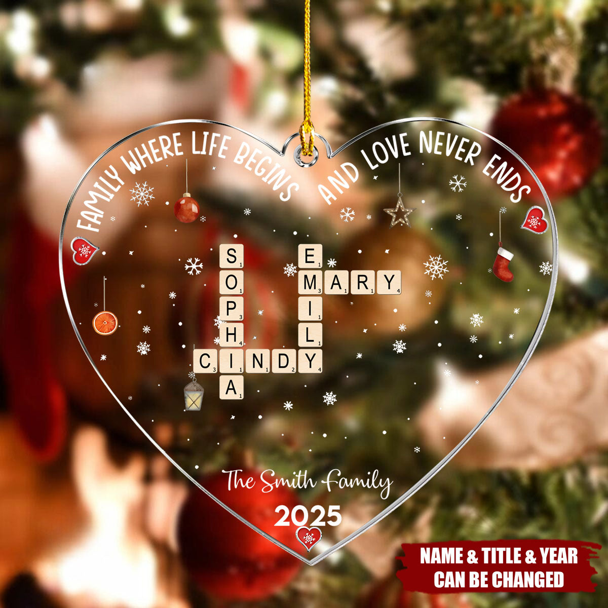 Celebrate your family story with this customizable Scrabble-style ornament - a unique tribute to your closest bonds.